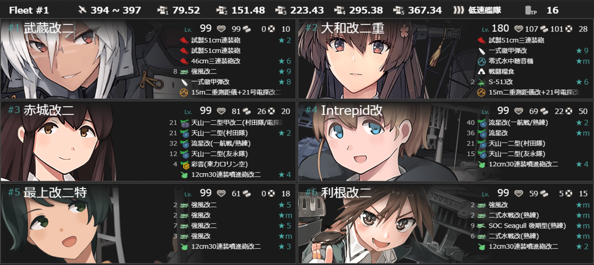 なお支援艦隊をカットした上でエリレと対面するため撤退率は5-5の編成のなかでもかなり高い部類。それもあってか(あと使用者が一人しかいないからか)残念ながら今まで大会できれいに通ったことはなかったと思います。