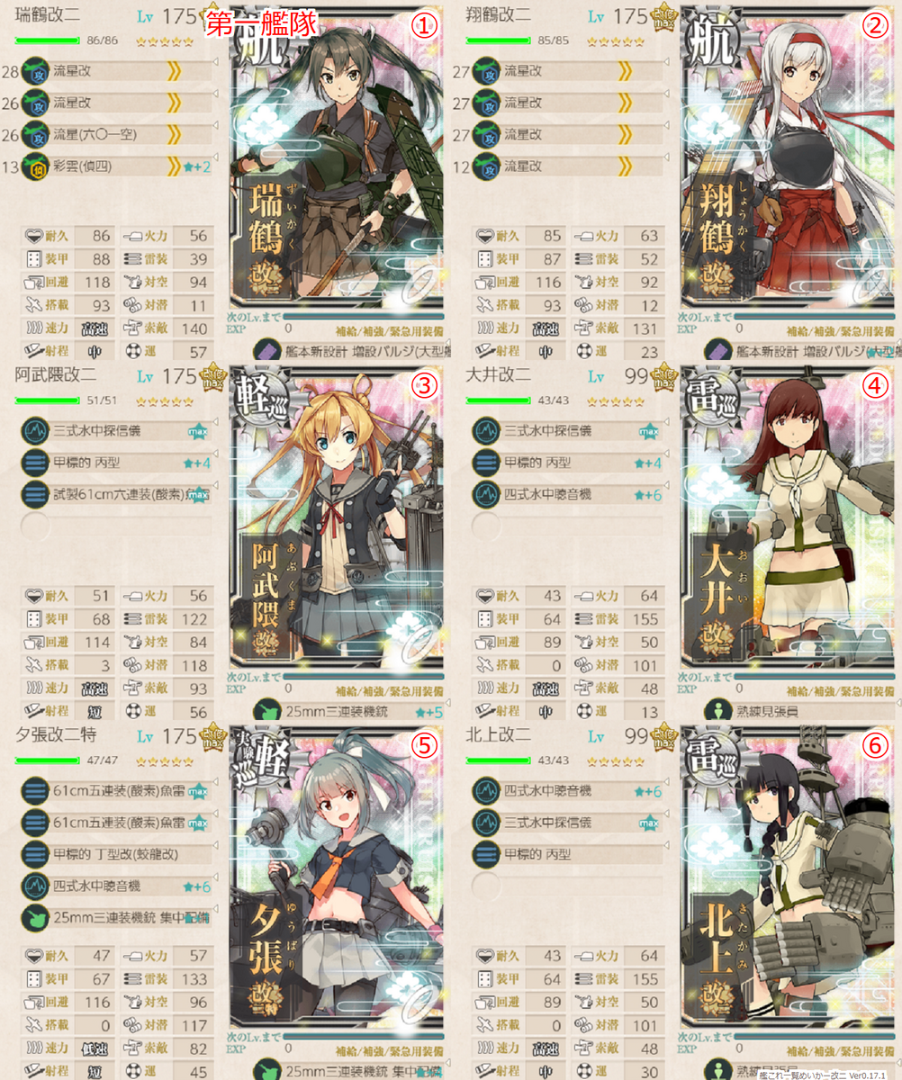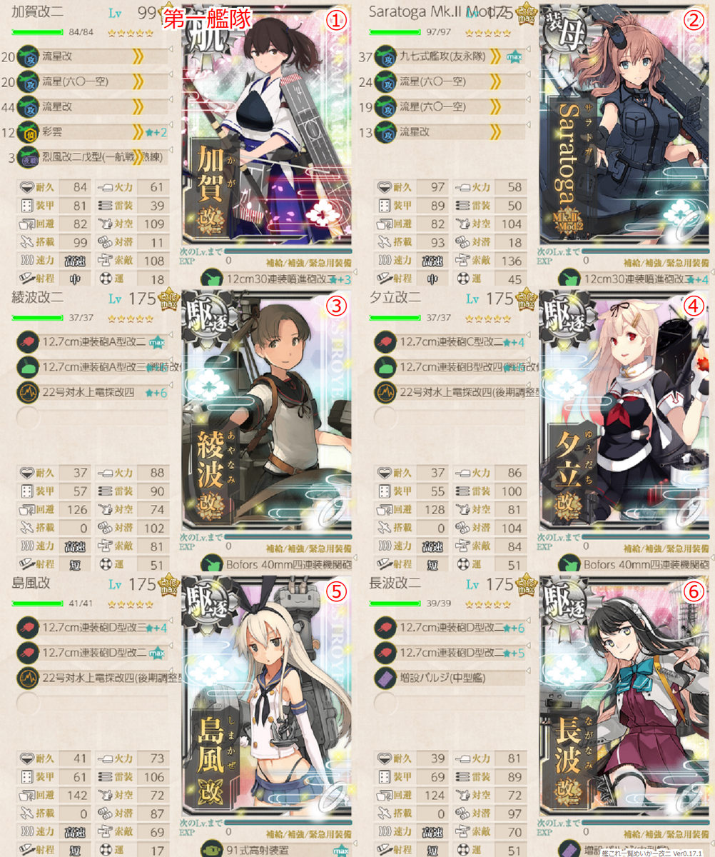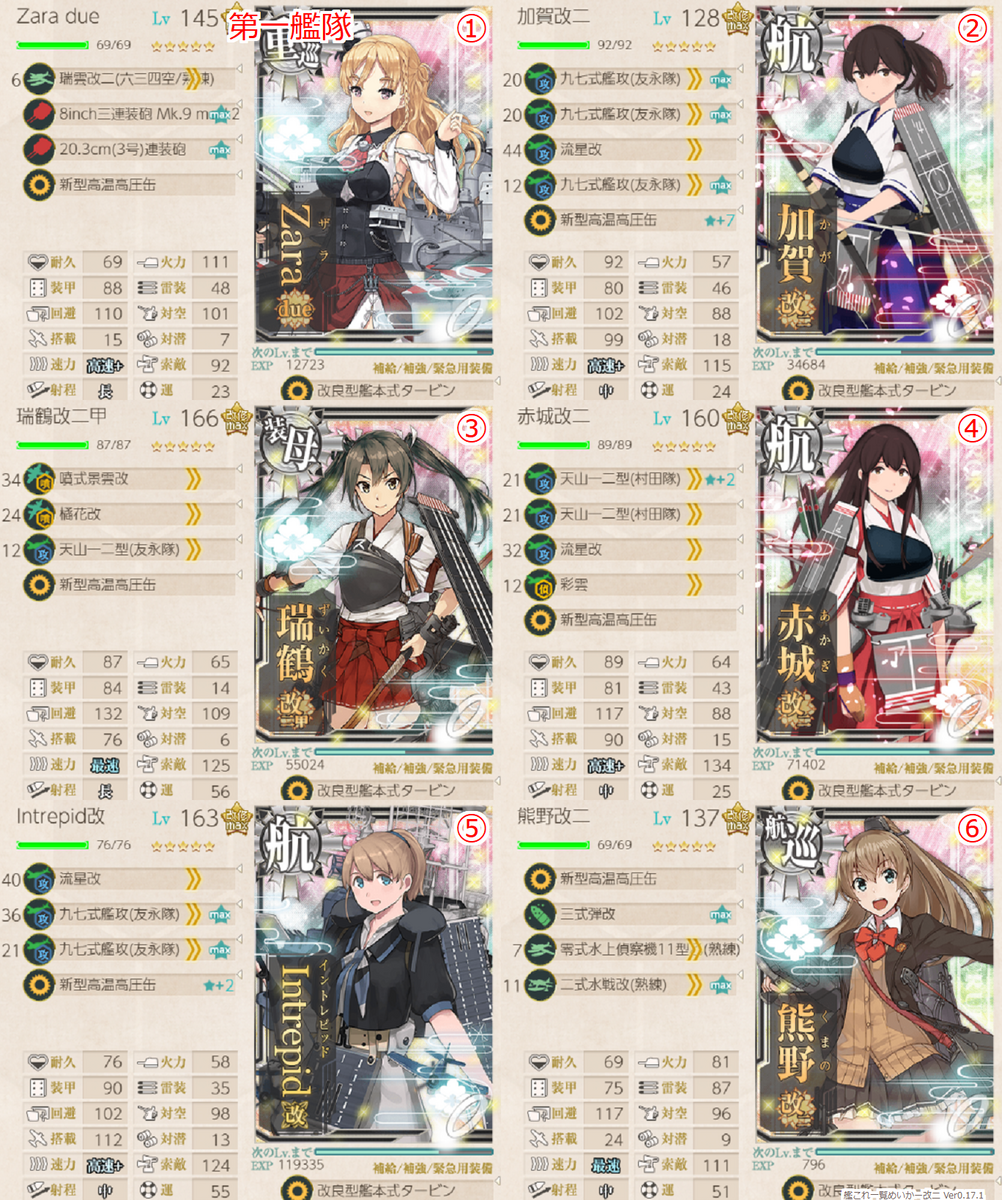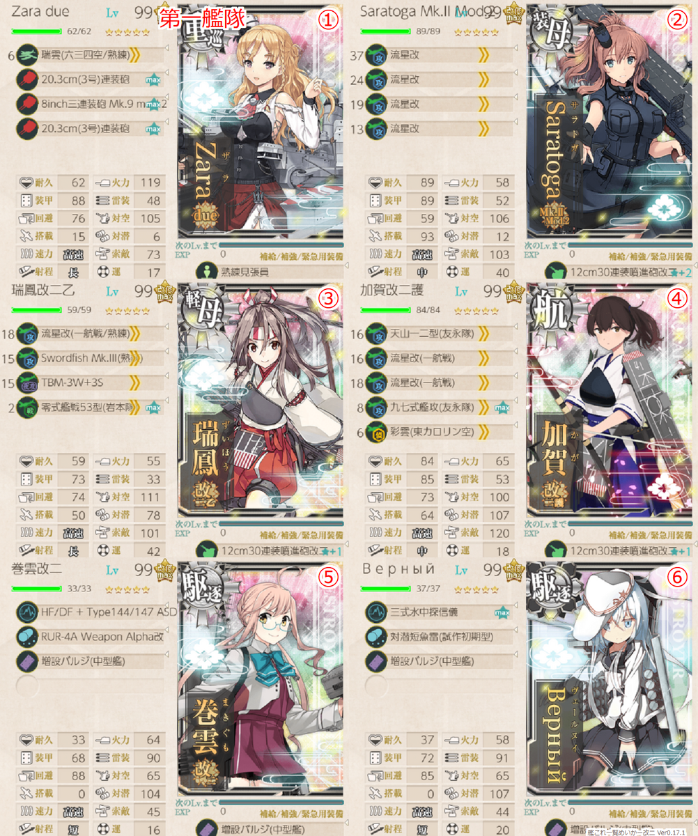 基本的には第四回λ杯の編成をベースに順当にスペックを上げられるところ上げた編成編成です。新規箇所としては4-4で加賀護を使うことで夕張ではなくZARAを採用し砲戦火力を上げているところ、4-5でのザラとジェットの採用でしょうか。