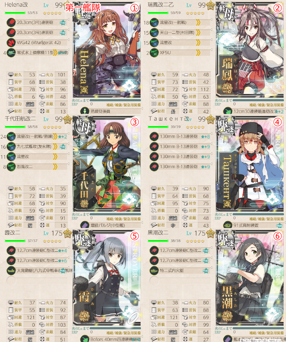 今見るとお世辞にも完成度の高い編成ではありませんがそれでも当時は必至でした。(瑞穂を5-3-Pでレベリングした記憶、弱すぎてめっちゃダメコン消費してました)。