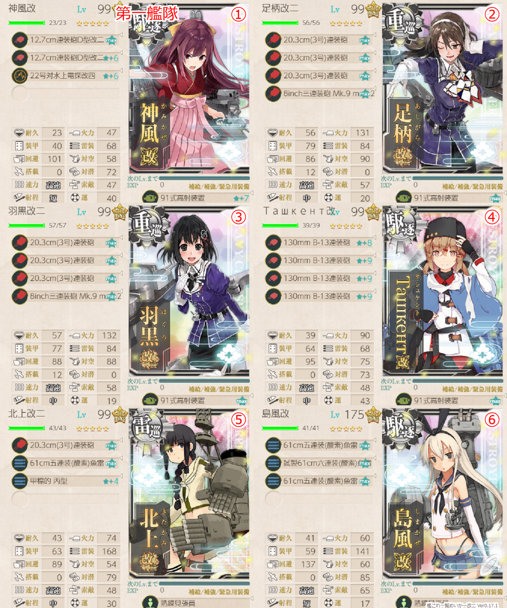 幸い私は神風のレベルが98とちょうどいい感じになっていたため急いで羽黒と足柄を調達、レベリングに取り掛かります。